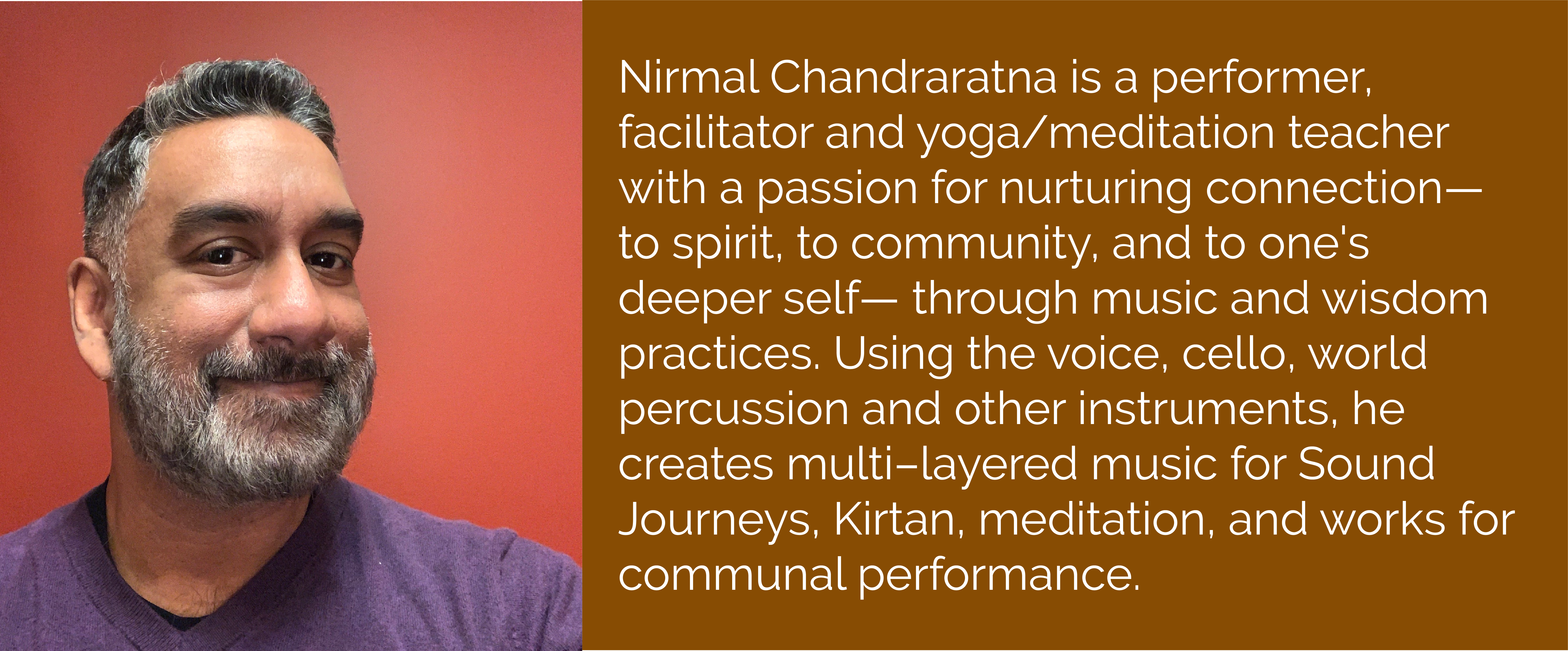 Nirmal regularly performs sound journeys, leads Kirtan, facilitates workshops, and hosts retreats throughout the Northeast. Nirmal began studying cello at the age of 9 and as a music major at Brown University, he decided to dedicate his life to music. After earning his Masters of Music in Composition from San Francisco Conservatory, he took a detour into the world of intentional music, particularly Kirtan— an ecstatic form of call–and–response chanting— and Sound Journeys. These musical practices perfectly matched his desire to bring both spiritual connection and audience immersion into his work.