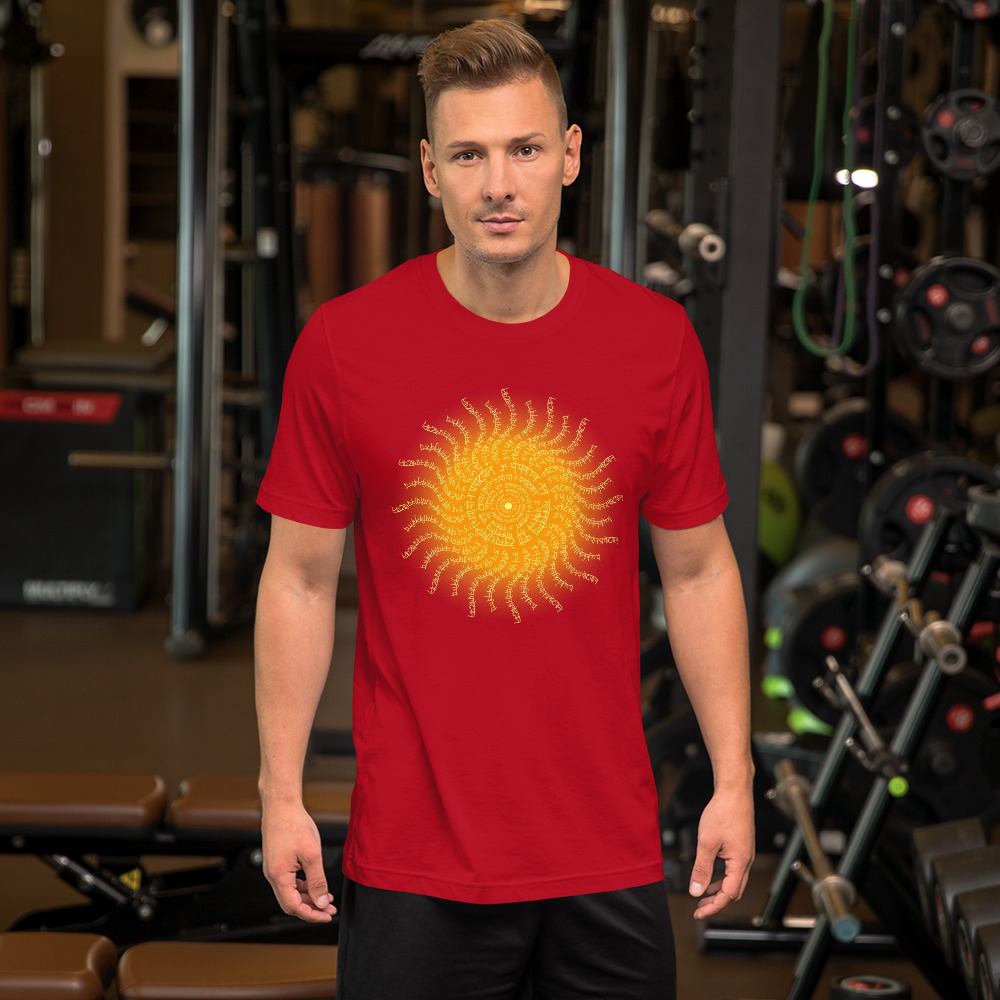 The sun, composed of the Gayatri Mantra in Sanskrit script, one of the oldest known Hindu mantra, which is in honor of the sun.